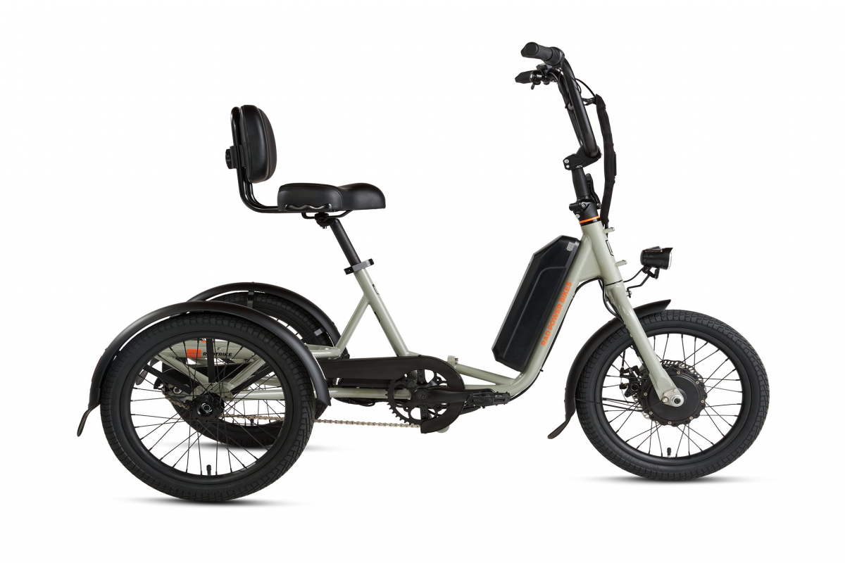 “The RadTrike Electric Tricycle by Rad Power Bikes is designed to provide a stable and comfortable riding experience, making it accessible to a wide range of riders. It features a top speed of 14 mph and offers a range exceeding 55 miles on a single charge. Equipped with a 750W motor, the RadTrike supports a payload capacity of up to 415 pounds.Key design elements include a step-thru frame for easy mounting and dismounting, an ergonomic saddle with an adjustable backrest, and a sweeping handlebar to ensure rider comfort. The tricycle is engineered to maneuver through standard doorways and features a reverse mode for navigating tight spaces. Additionally, the fold-down handlebars facilitate convenient storage and transport.Features:Motor and Battery: Equipped with a 750W brushless geared hub motor and a 480Wh battery, the RadTrike supports a range of up to 55 miles and achieves a top speed of 14 mph.Frame and Design: The tricycle features a step-thru chromoly steel frame, accommodating riders from 4’10” to 6’4″. The low-step design facilitates easy mounting, and the handlebars fold down for convenient storage and transport.Drivetrain and Braking: It utilizes a single-speed drivetrain with a 42T crankset, complemented by a front mechanical disc brake and rear coaster brakes for reliable stopping power.Tires and Safety: Fitted with 18″ x 2.25″ Kenda Kontact tires that include K-Shield puncture-resistant liners and reflective sidewalls, the RadTrike ensures enhanced visibility and durability. LED headlights and taillights are standard for increased safety.Comfort and Accessibility: An extra-cushioned saddle with an adjustable backrest provides ergonomic support, making the tricycle suitable for individuals with limited mobility.Payload Capacity: With a total payload capacity of 415 lbs (including a maximum rider weight of 325 lbs), the RadTrike is capable of carrying substantial cargo, making it ideal for various hauling needs.Ride in comfort and style with the RadTrike – the ultimate three-wheeled adventure machine from Rad Power Bikes! “